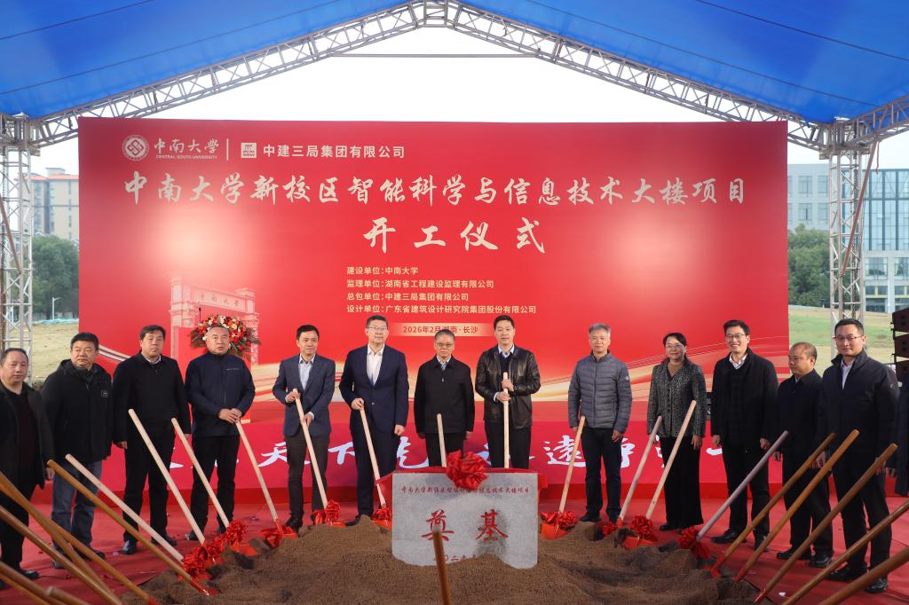 2026年2月26日上午,中南大学新校区智能科学与信息技术大楼项目开工仪式在潇湘校区举行。中南大学党委副书记蒋建湘,中南大学党委常委、副校长何旭辉,湘江新区开发建设局(交通运输局)党组成员、副局长王建辉,学校相关职能部门负责人及各参建单位负责人等出席仪式。